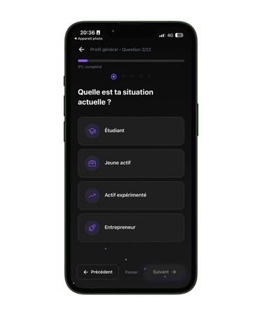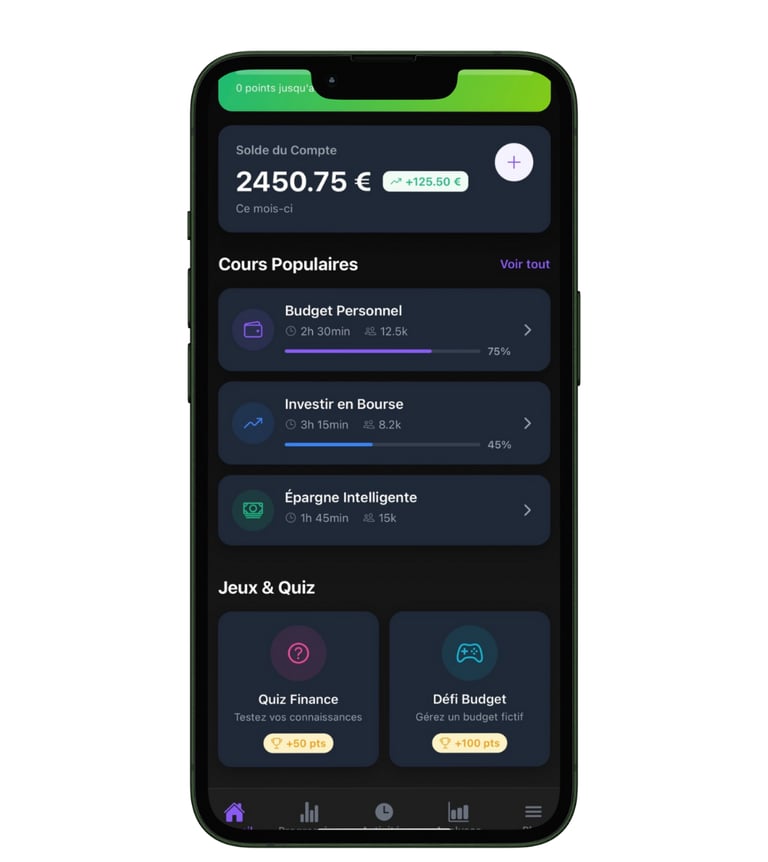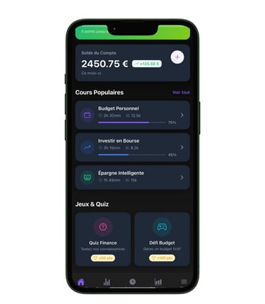 Progresse à ton rythme avec un parcours adapté à ton niveau : mini-cours clairs, défis interactifs et évolution du statut Débutant à Expert pour devenir maître de tes finances.