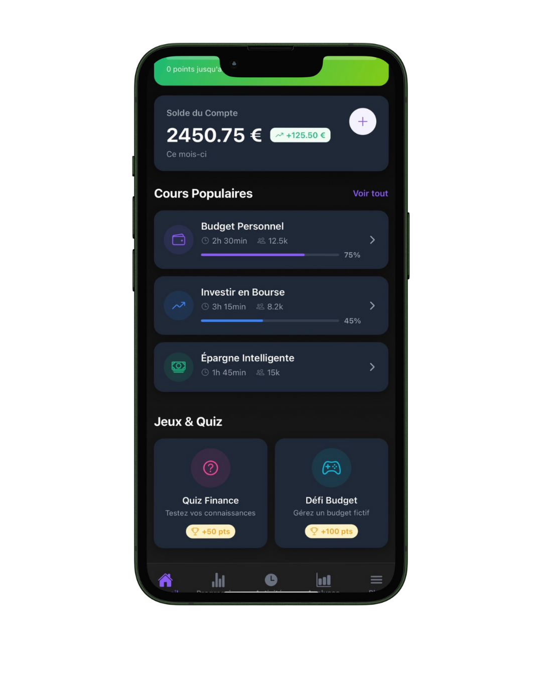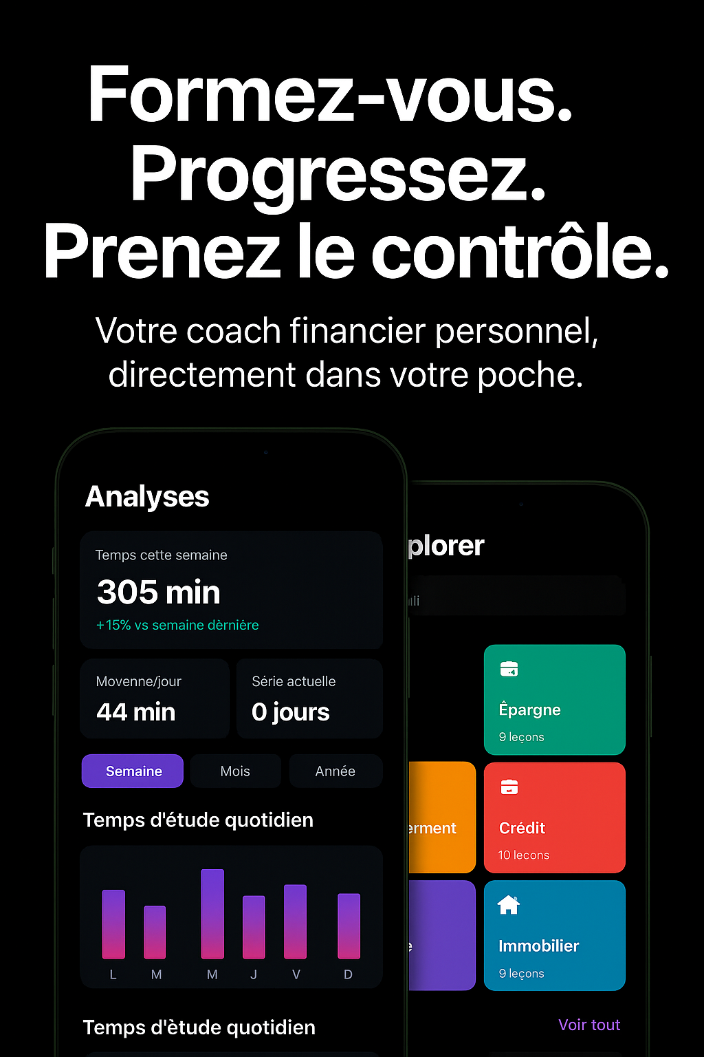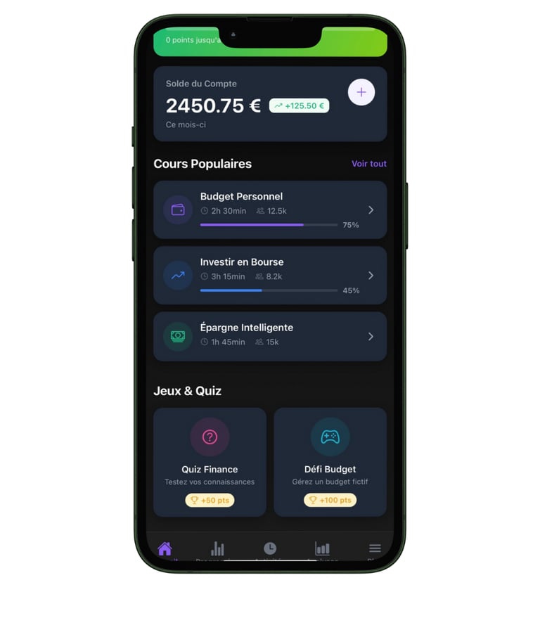 Progresse à ton rythme avec un parcours adapté à ton niveau : mini-cours clairs, défis interactifs et évolution du statut Débutant à Expert pour devenir maître de tes finances.